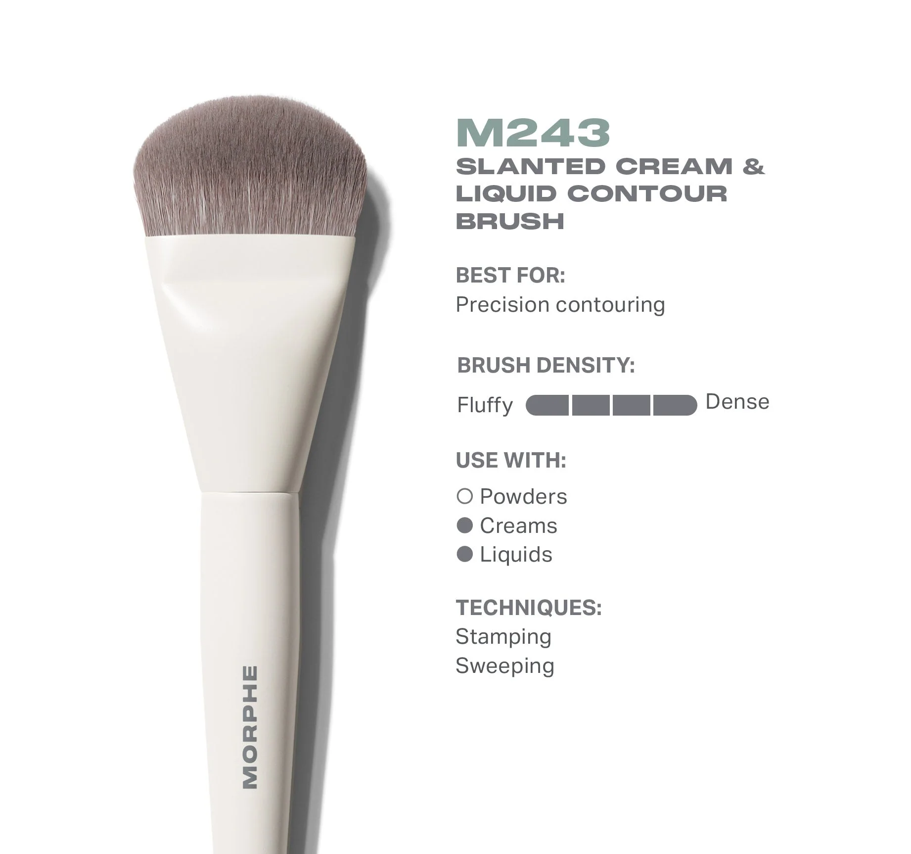 The M243 Slanted Cream & Liquid Contour Brush combines the power of a paddle and the precision of a slant in one. The benefit? A firm, flat tip for stamping on product to map out your contour before blending it out. Use it on your cheek hollows, jawline, or anywhere you want targeted color laydown.