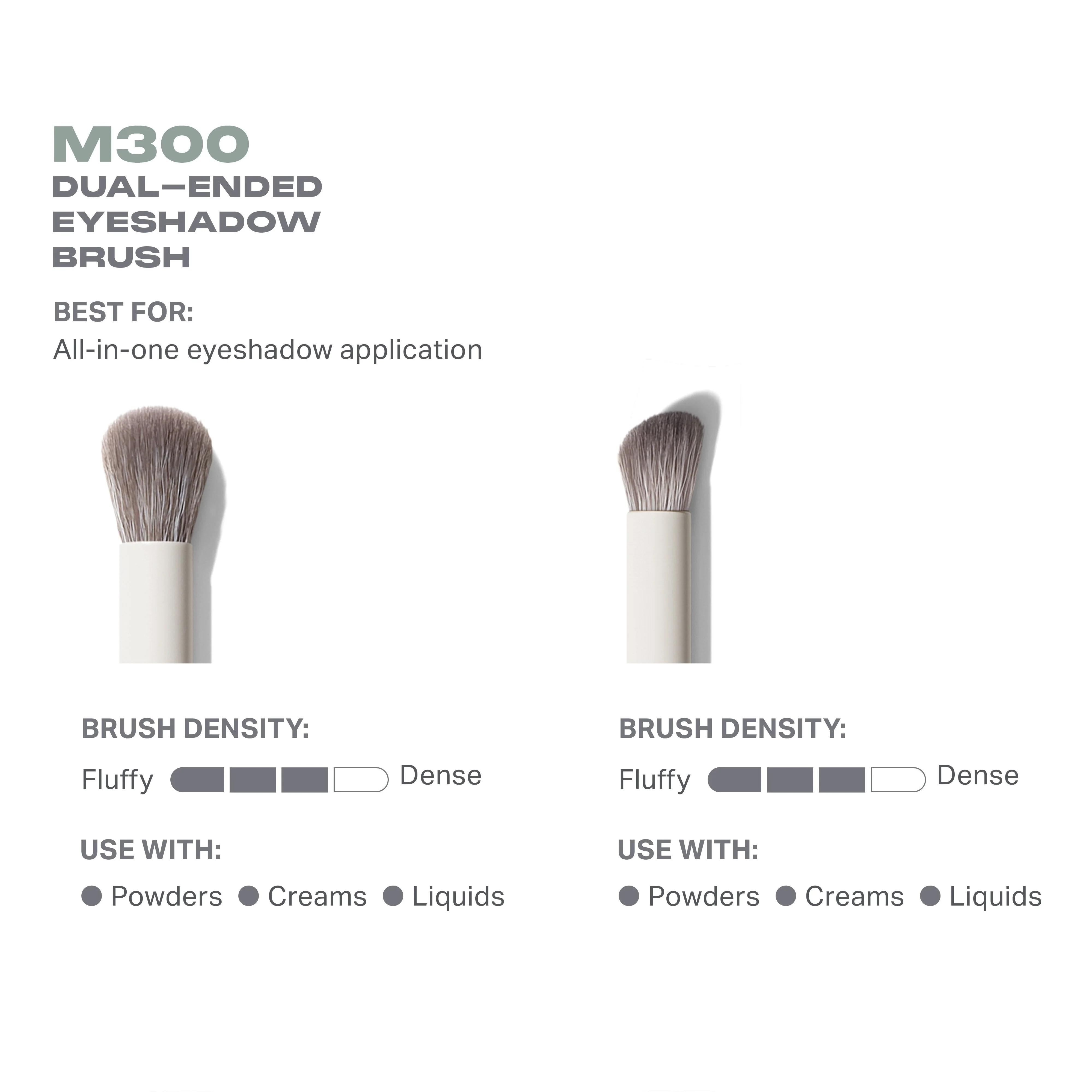 The M300 Dual-Ended Eyeshadow Brush simplifies your eye application routine without compromising your results. Use the rounded end to build allover color, and the sloped end to pack color onto your lids and precisely define your outer and inner corners.