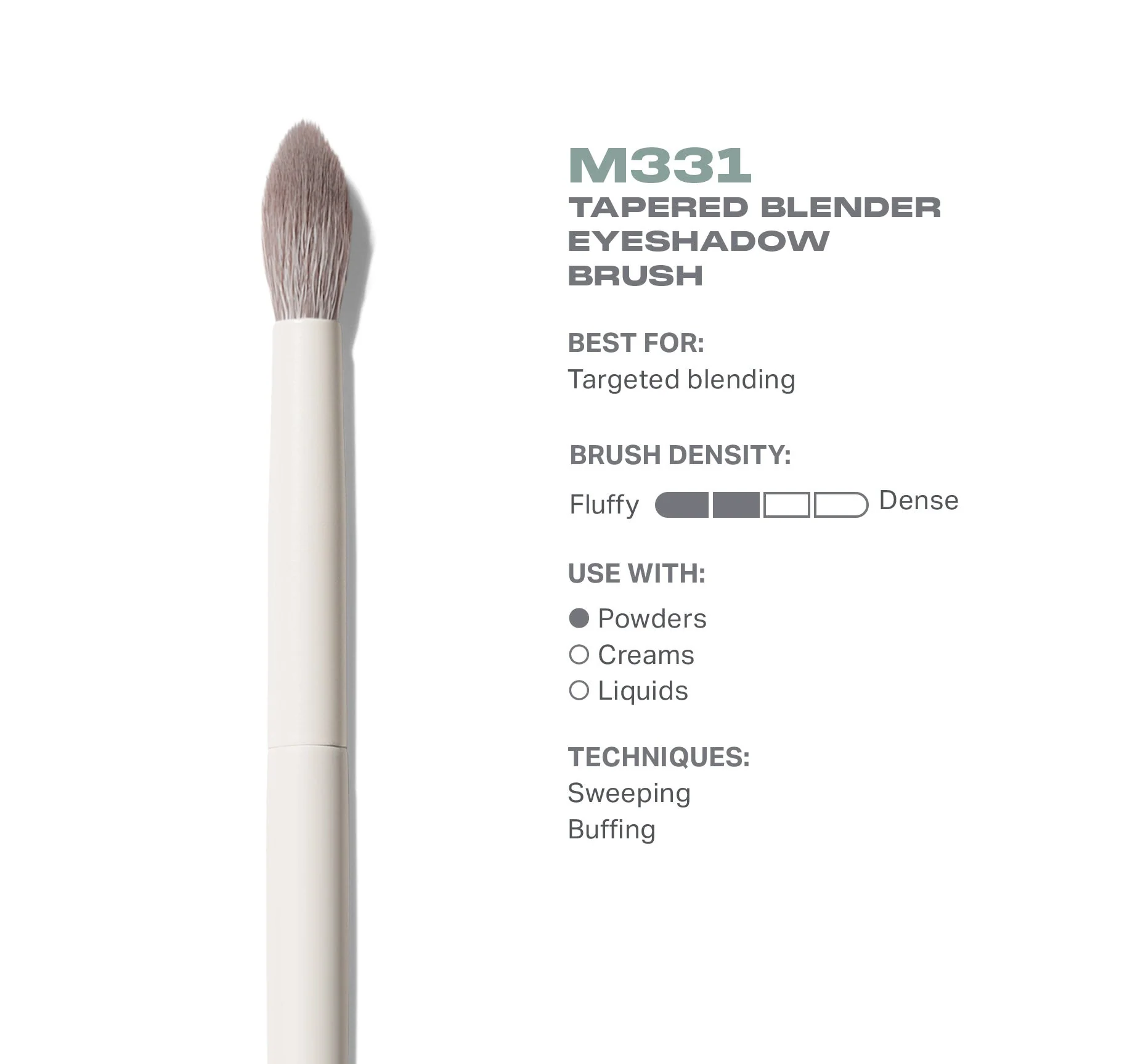 The M331 Tapered Blender Eyeshadow Brush has a fluffy tip with a precisely cut taper that makes it perfect for targeted blending. Use it to sweep on and buff out eyeshadow in your creases. It will maintain color concentration, while diffusing out harsh lines.